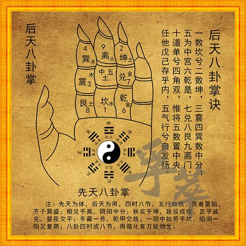 后天八卦手訣是古代用于占卜和預(yù)測吉兇的一種方法。通過在手掌上排列八卦,結(jié)合天干、地支、五行等元素,來推演吉兇禍福。以下是對后天八卦手訣吉兇的詳細(xì)詳解。