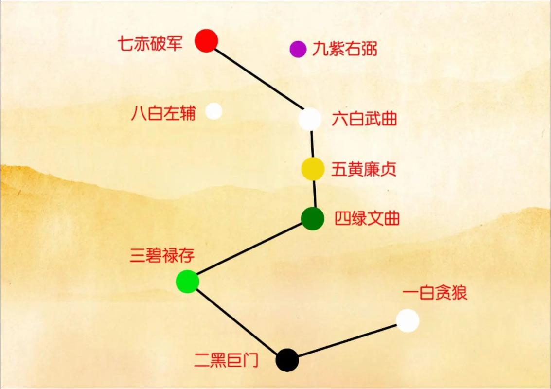4. 九星與北斗九星的關(guān)系:奇門遁甲中的九星源于古代北斗九星的概念,加上左輔星和右弼星。天樞星對應(yīng)天蓬星,天璇星對應(yīng)天芮星,天璣星對應(yīng)天沖星,天權(quán)星對應(yīng)天輔星,玉衡星對應(yīng)天禽星,開陽星對應(yīng)天心星,瑤光星對應(yīng)天柱星,左輔星對應(yīng)天任星,右弼星對應(yīng)天英星。
