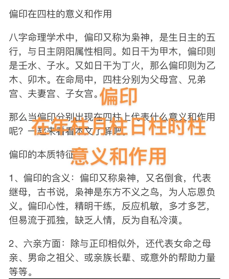 偏印在四柱八字中具有多重作用,其影響因位置和組合而異。以下是偏印在四柱中的具體作用: