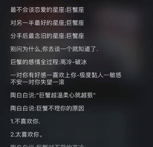 巨蟹座不再想談戀愛是一個復(fù)雜且充滿感情的過程。通過了解他們的信號和采取適當(dāng)?shù)膽?yīng)對措施,你可以平穩(wěn)地渡過這段時期,并最終找到自己的幸福。