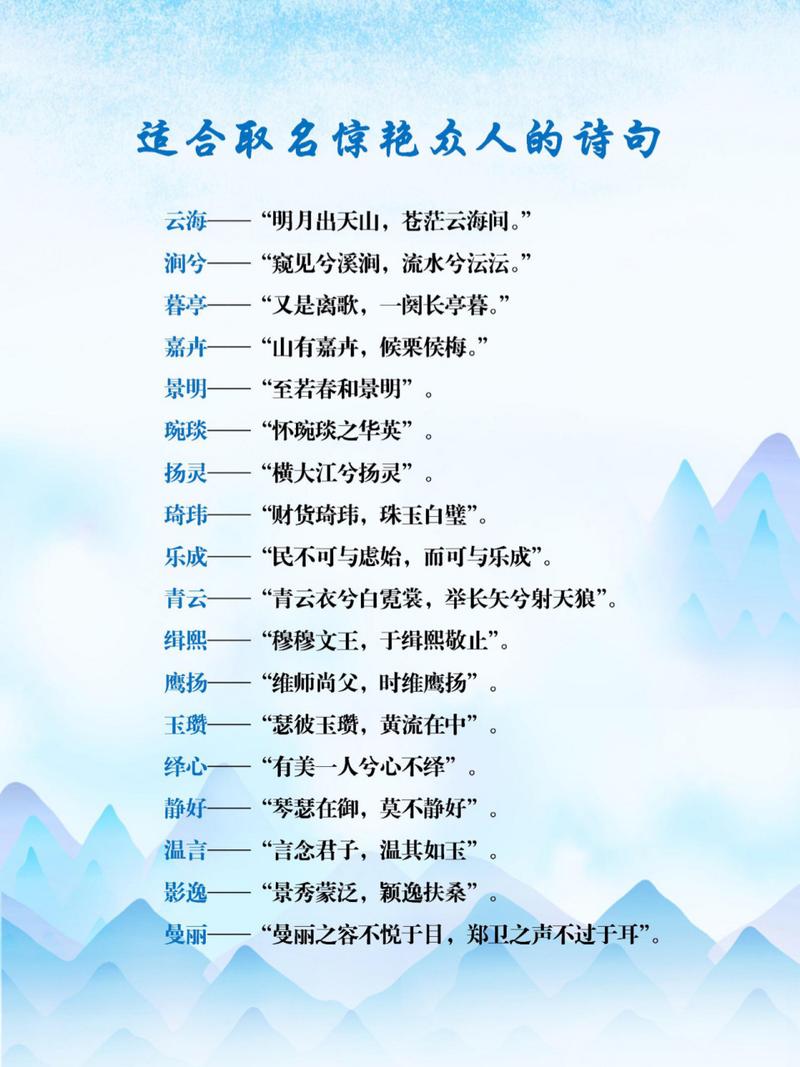 給寶寶起名時(shí),選擇富有詩(shī)意的名字不僅能體現(xiàn)文化底蘊(yùn),還能寄托父母的美好愿望。以下是一些從古詩(shī)詞中精選的寶寶名字及其出處和寓意。