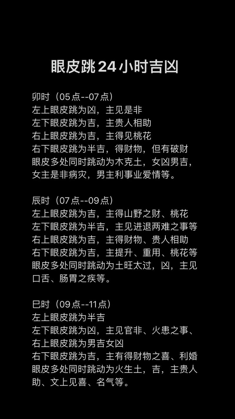 五行理論:在中國(guó)傳統(tǒng)文化中,五行(木、火、土、金、水)與十二時(shí)辰相對(duì)應(yīng)。左眼上眼皮代表木,下眼皮代表火;右眼上眼皮代表金,下眼皮代表水;兩處或以上位置同時(shí)跳動(dòng)代表土。