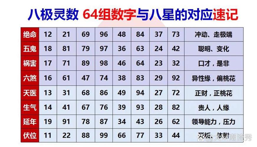 數(shù)字八星吉兇的具體判斷標(biāo)準(zhǔn)主要基于數(shù)字的組合及其對應(yīng)的能量。以下是八星的具體判斷標(biāo)準(zhǔn):