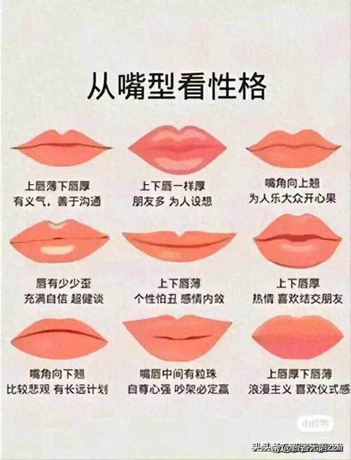 不同嘴型反映出的性格特征各異。例如,櫻桃小嘴的女性溫婉柔弱,大嘴的女性豪爽大方,嘴唇肥厚的女性憨厚老實,嘴唇薄而無肉的女性口才伶俐,四字口的女性聰明智慧。