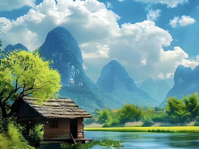 正午時分,太陽高懸于空,向大地傾瀉著萬丈金光。樹木在陽光的照耀下泛著綠意,仿佛為大地披上了祖母綠色的錦緞。水面上波光粼粼,倒映出天空的湛藍和云朵的潔白??諝庵袕浡鴮庫o與祥和的氣息。