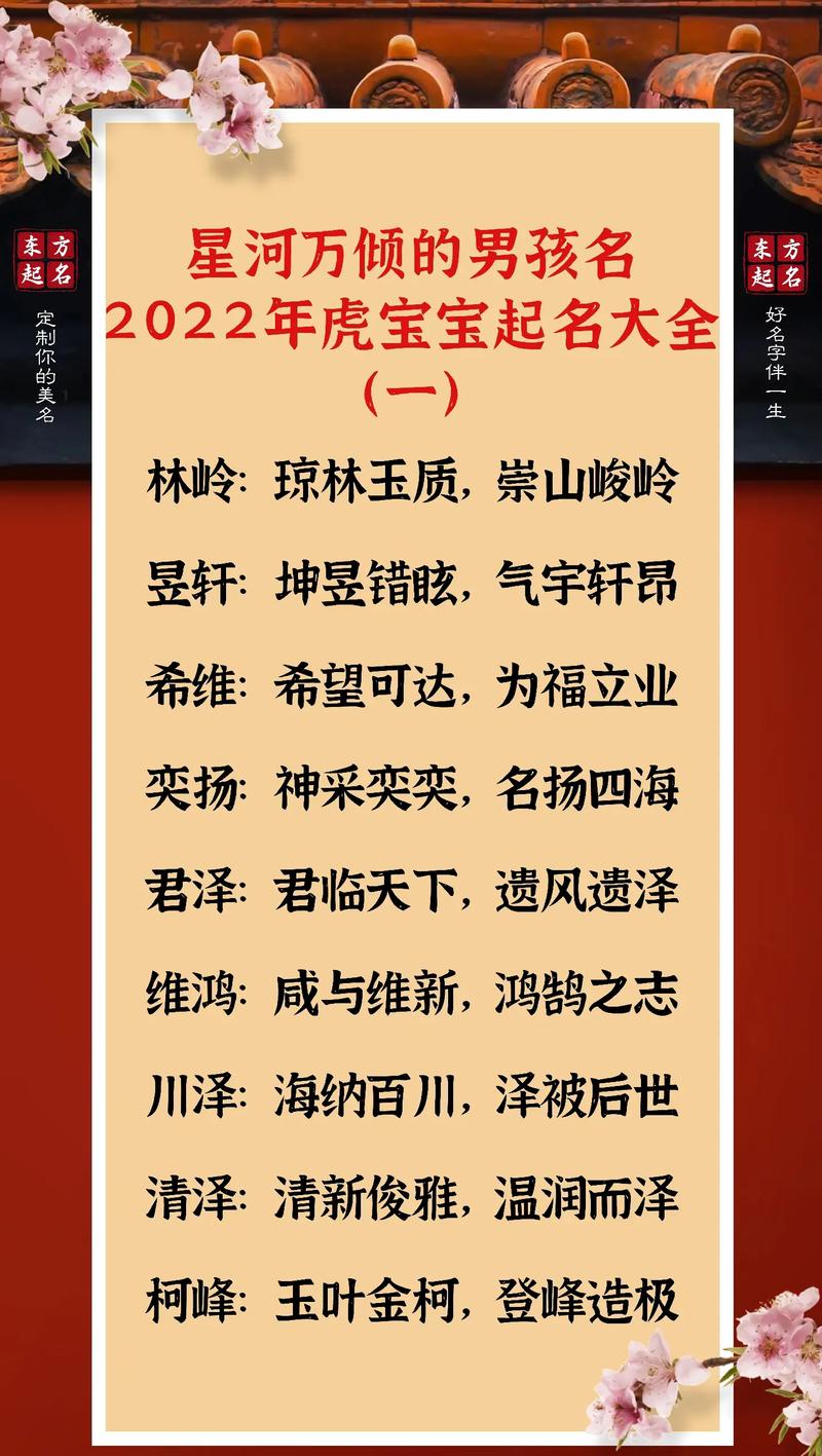 2. 智慧與才能:虎年出生的寶寶通常精力旺盛,有領(lǐng)導(dǎo)才能。名字中可以加入“?!薄ⅰ爸恰?、“杰”等字,寓意聰明、智慧和杰出。