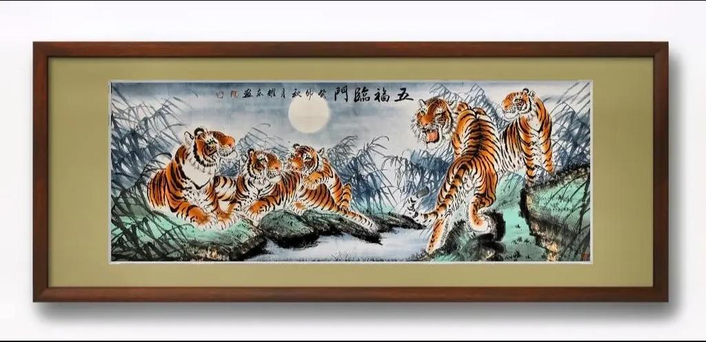 根據(jù)風(fēng)水畫五虎臨門的不同場景,還有不同的寓意。您可以在家中或辦公室懸掛一幅五虎臨門畫,以祈求好運和平安。