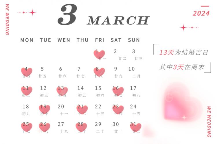 準(zhǔn)備在2024年3月和4月結(jié)婚的新人,選擇合適的吉日是非常重要的一步。這不僅符合中國的傳統(tǒng)習(xí)俗,也能為新人帶來好運和美好的祝愿。以下是一些推薦的結(jié)婚吉日,供您參考。