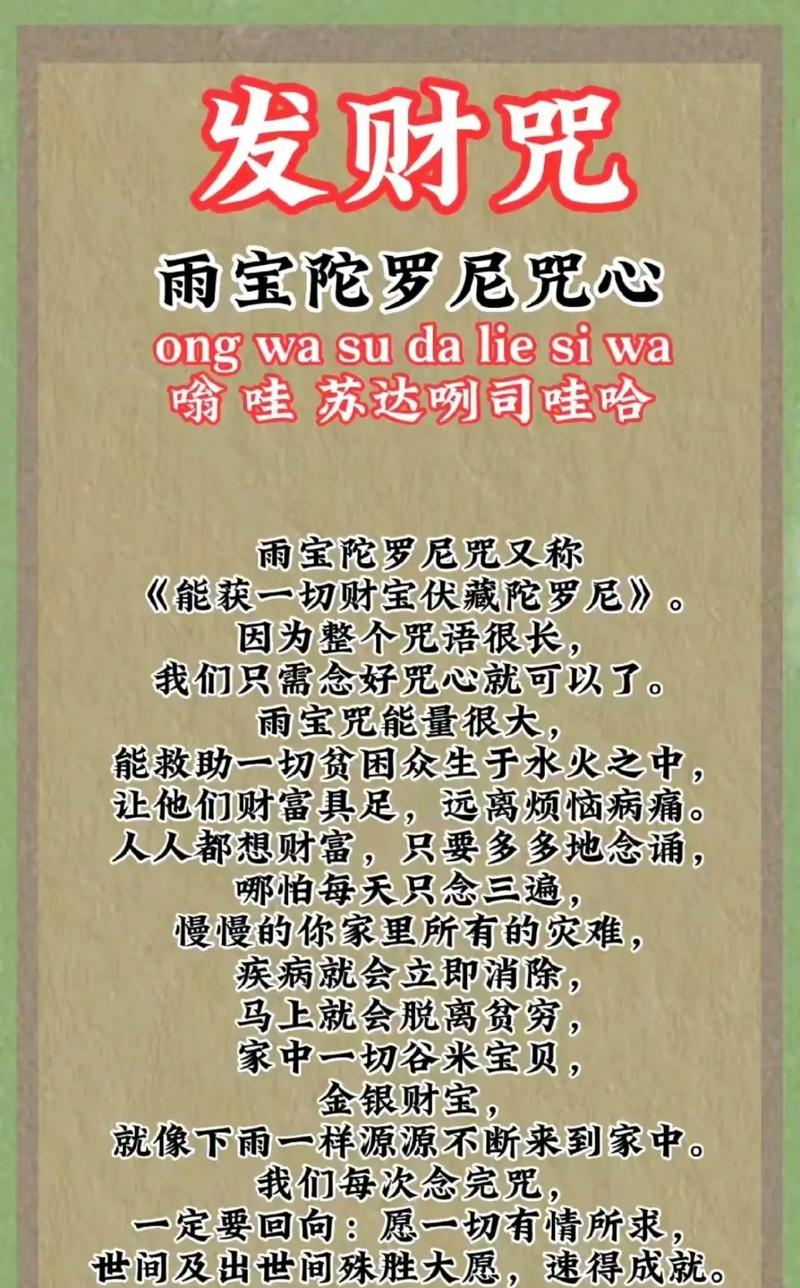 念八字發(fā)財咒需要先了解其具體的念法,這對于準確地念出合適發(fā)音至關(guān)重要。下面是一些常見八字發(fā)財咒的念法: