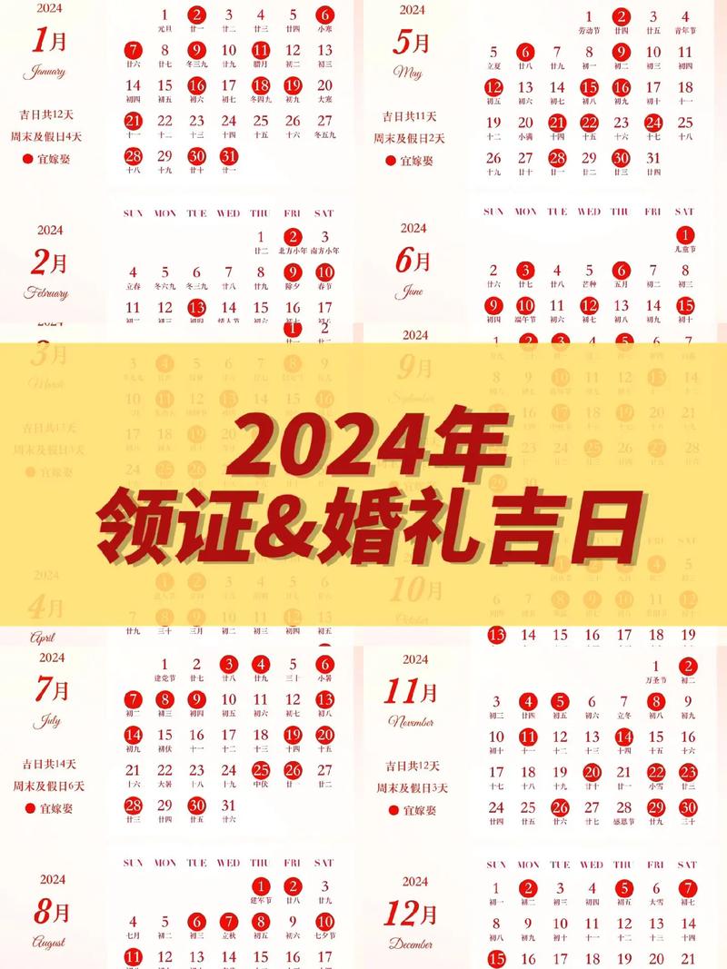 導讀:想要領(lǐng)結(jié)婚證的新人們,可以先挑選好時間,然后根據(jù)該登記處要求的,將登記需要的相關(guān)證件、照片、證明材料等提前準備好,這樣去婚姻登記處辦理相關(guān)手續(xù)時會很快進行。那么,2024年領(lǐng)證最好的日子是哪些呢?下面是小編帶來的2024年領(lǐng)證吉日吉時查詢,一起去瞧瞧吧。