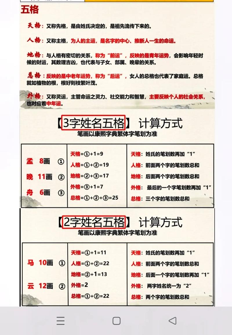 1. 五格剖象法:這是一種基于《易經(jīng)》理論的姓名分析方法,通過計(jì)算姓名的天格、人格、地格、外格和總格等五格數(shù)理,來推斷一個(gè)人的運(yùn)勢(shì)。