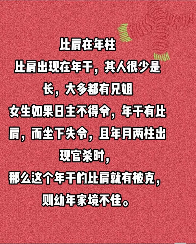 年柱比肩:表示上有兄姐或養(yǎng)子,可能有獨(dú)立分家的傾向,早年生活可能較為貧苦。