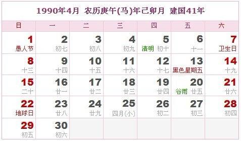 對(duì)于中國(guó)人來說,陰歷日期更為重要。陰歷的每個(gè)月通常由29天或30天組成。1990年4月的陰歷日期如下: