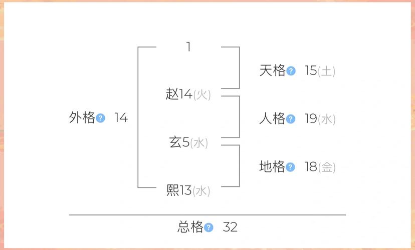 天格:天格數(shù)理的五行屬性可以通過天格的筆畫數(shù)來確定。根據(jù)五行與數(shù)字的對應(yīng)關(guān)系,木對應(yīng)1、2,火對應(yīng)3、4,土對應(yīng)5、6,金對應(yīng)7、8,水對應(yīng)9、0。
