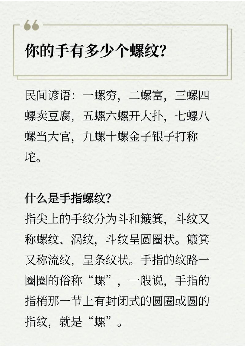 手螺指的是女性手掌中的螺旋紋,又稱“玉螺紋”。螺紋多而深者,常被人稱為“旺夫手”。這類女性做事穩(wěn)重踏實(shí),有極強(qiáng)的責(zé)任心和事業(yè)心。她們通常事業(yè)有成,財(cái)運(yùn)亨通,是家庭的頂梁柱。