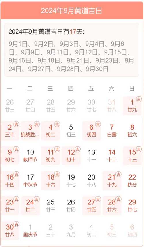 九月黃道吉日是指在中國(guó)傳統(tǒng)文化中,適合進(jìn)行重要活動(dòng)的吉利日子。以下是2024年9月的黃道吉日列表及其相關(guān)信息。
