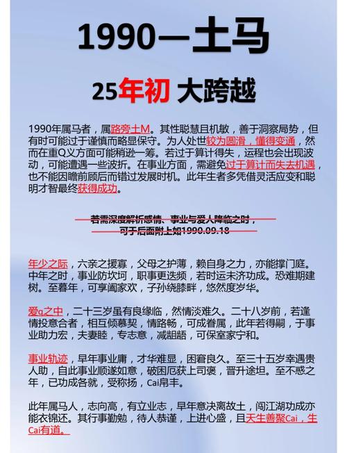 1990年出生的屬馬人,五行屬土,性格熱情奔放,積極向上。流年似水,每個月份的星象變化都會對他們的運勢產(chǎn)生影響。了解每個月的運勢,有助于提前規(guī)劃,趨吉避兇。以下將逐月分析1990年屬馬人的運勢,供您參考。