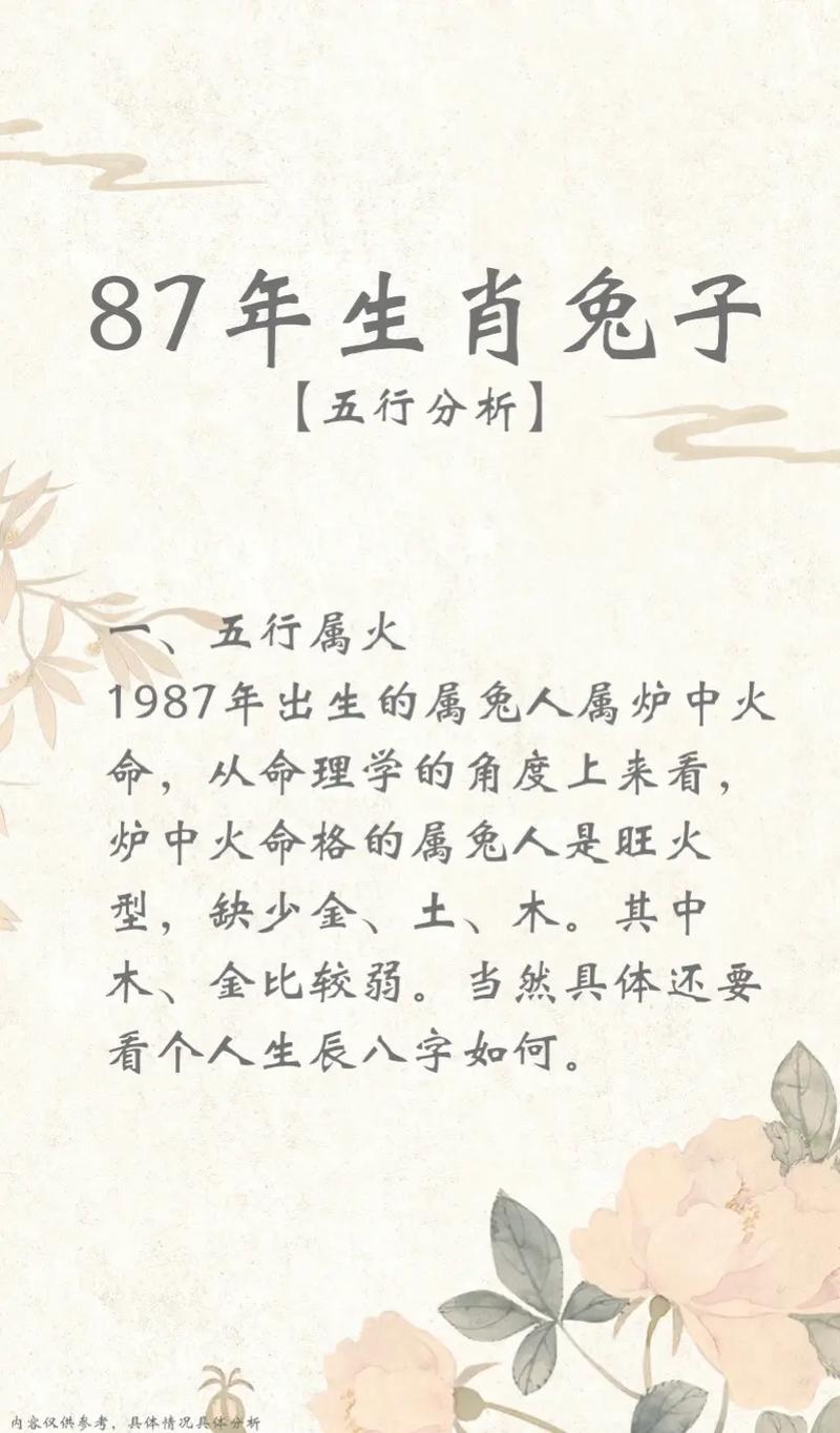 1987年屬兔人的五行屬火木。1987年是農(nóng)歷丁卯年,丁為天干,屬火;卯為地支,屬木。1987年出生的屬兔人五行屬性為火木。