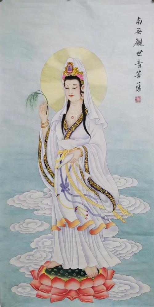 工筆畫,顧名思義,以精細(xì)的筆觸描繪事物,注重細(xì)節(jié)刻畫,追求形似與神似。在工筆觀音菩薩像中,每一根線條、每一個(gè)色彩,都凝聚著畫師的匠心獨(dú)運(yùn)。這要求畫師不僅要有高超的繪畫技巧,更要有對(duì)觀音菩薩的深刻理解。通過衣袂飄飄的線條,展現(xiàn)其出塵之姿;通過慈眉善目的表情,傳遞其普度眾生之愿。