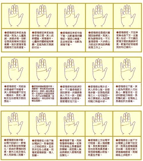 感情線:體現(xiàn)情感態(tài)度、人際關(guān)系。向上彎曲,感情豐富,表達(dá)直接;向下彎曲,內(nèi)斂含蓄,不善表達(dá);島紋較多,情感經(jīng)歷復(fù)雜,容易受傷。