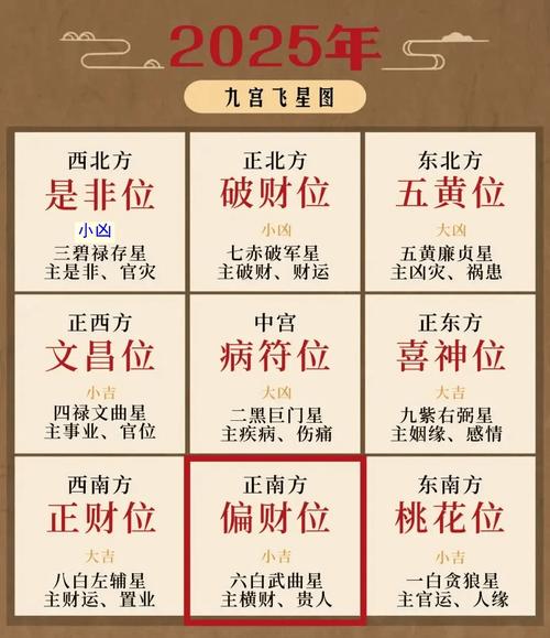 九宮飛星理論是風(fēng)水學(xué)中的重要組成部分,它將洛書九宮格與九顆星曜(一白貪狼星、二黑巨門星、三碧祿存星、四綠文曲星、五黃廉貞星、六白武曲星、七赤破軍星、八白左輔星、九紫右弼星)聯(lián)系起來。每年、每月甚至每日,九顆星曜會飛臨不同的宮位,從而影響該方位的運(yùn)勢。其中,八白左輔星被視為正財(cái)星,六白武曲星被視為偏財(cái)星,兩星飛臨的方位,即為當(dāng)日的有利財(cái)位。