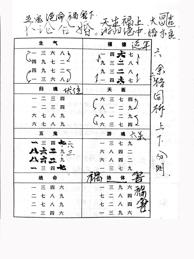 例如,男方坎宮,女方巽宮。查表得知,坎宮與巽宮的關(guān)系為“生氣”,屬于大吉之象,預(yù)示著婚姻美滿幸福。_