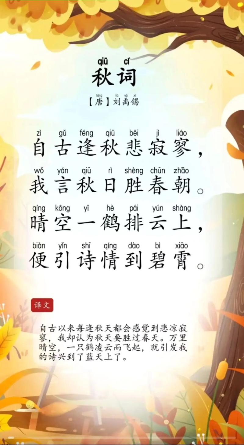 《秋詞》為唐代詩人劉禹錫所作,全詩意境蕭瑟,透著淡泊寧靜和曠達(dá)。