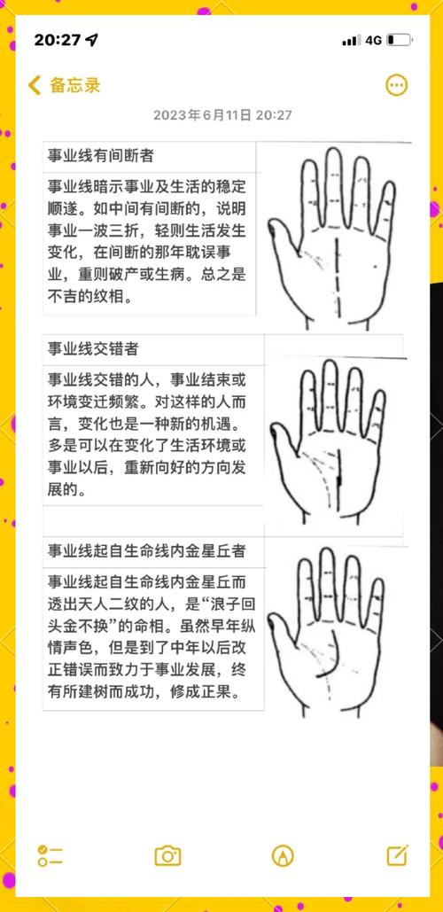 事業(yè)線又稱命運(yùn)線,是從手掌底部向上延伸的紋路,代表著一個(gè)人一生的事業(yè)發(fā)展軌跡。事業(yè)線清晰、深長、筆直,代表著事業(yè)發(fā)展順利、穩(wěn)定,容易取得成功。如果事業(yè)線斷裂、雜亂、彎曲,則代表著事業(yè)發(fā)展不穩(wěn)定、波折,容易遭遇挫折。