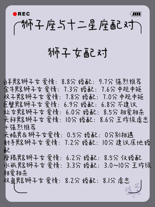 以下將從愛(ài)情和友誼兩個(gè)維度,詳細(xì)分析獅子座與十二星座的配對(duì)情況,并以表格形式呈現(xiàn),方便讀者查閱和參考。