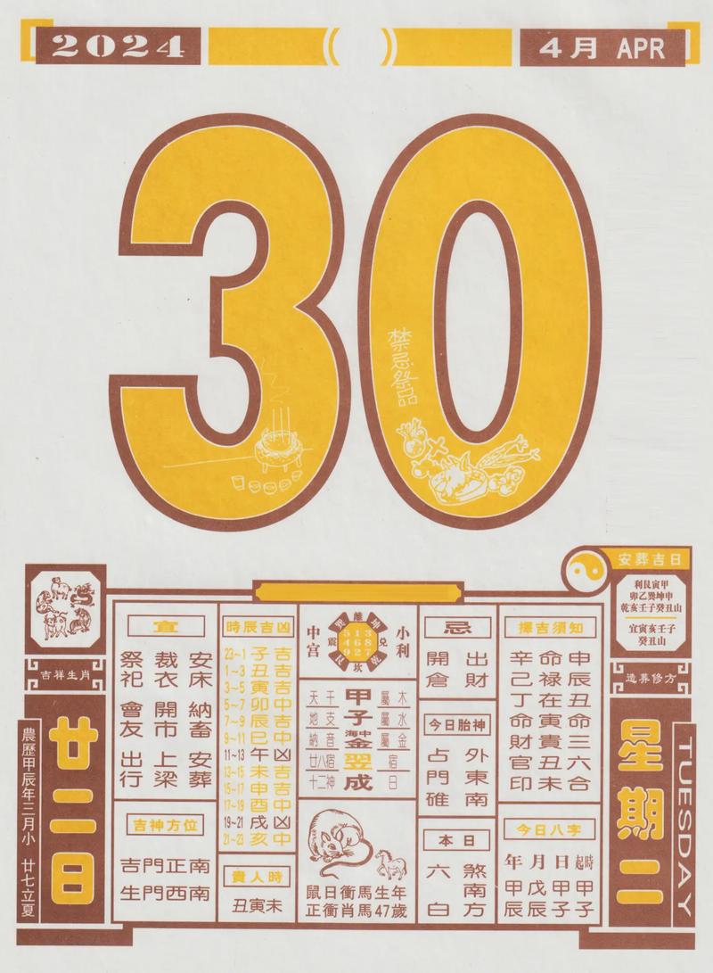 為了更直觀地說明問題,我們假設(shè)某年的農(nóng)歷四月三十號對應(yīng)如下信息(以下信息僅為假設(shè),具體情況需查閱當(dāng)年的黃歷):