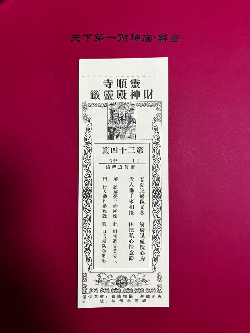 靈順?biāo)仑?cái)神殿第14簽,是一支上上簽。此簽名為「喜氣盈門」,寓意著財(cái)運(yùn)亨通、事業(yè)順利、喜事連連。