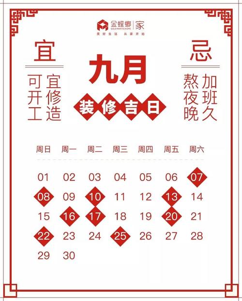 由于每年九月的具體日歷和星象運行情況不同,因此每年的九月黃道吉日也略有差異。以下提供一個通用的九月裝修吉日查詢方法,您可以參考使用: