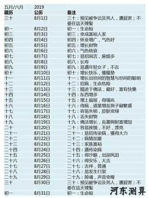 8月 7月19日 8月16日 六月 對(duì)應(yīng)藏歷日期請(qǐng)查閱完整藏歷 例如:初一、十六、二十九 例如:初八、二十 具體情況請(qǐng)參考當(dāng)?shù)夭貧v
