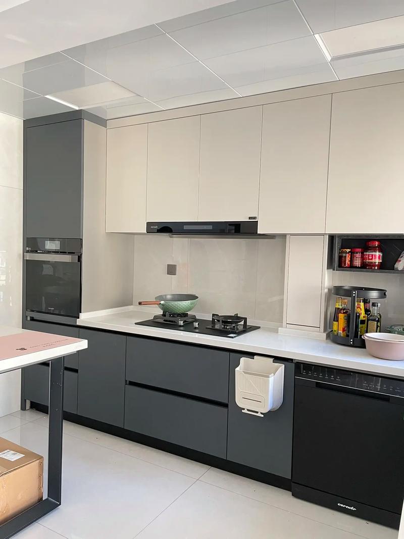 案例三:黑色石英石臺(tái)面搭配灰色櫥柜。黑色屬水,灰色屬金,水克火,對(duì)廚房火氣有一定的克制作用。這種搭配冷酷現(xiàn)代,如果喜歡,需要搭配其他暖色調(diào)的裝飾品,例如米色系的掛畫,或木質(zhì)餐具。