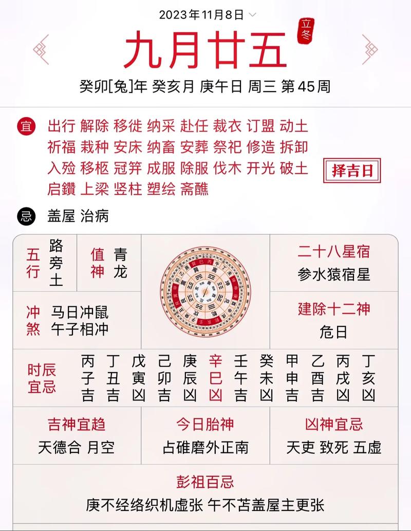 宜: 開業(yè)、結(jié)婚、搬家(需避開兇時)、祭祀、祈福、簽約、訂婚、出行(需避開兇時)、修造(需避開兇時)、種植。