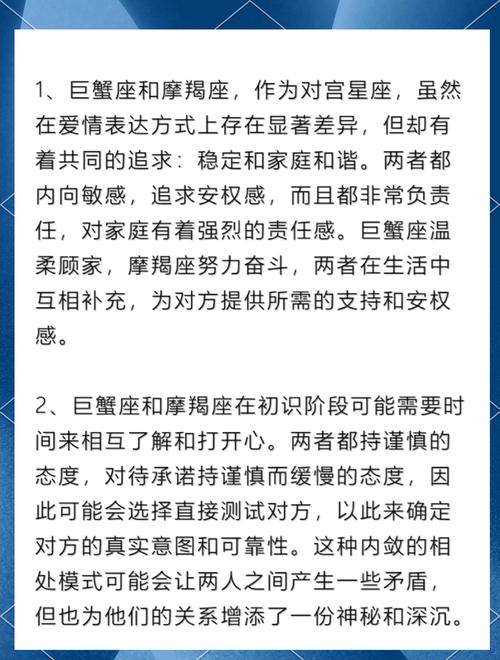 3. 適當(dāng)妥協(xié): 為了維護(hù)關(guān)系,雙方都需要做出一定的讓步。巨蟹座可以嘗試更理性地看待問(wèn)題,而摩羯座則可以嘗試更多地關(guān)注家庭和情感。
