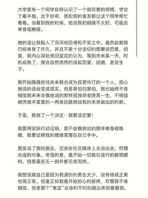 面對(duì)算命先生“婚姻不順利”的預(yù)言,最重要的是保持理性,避免陷入自我暗示的陷阱。心理學(xué)研究表明,人們往往會(huì)不自覺(jué)地去驗(yàn)證自己相信的事情,這種現(xiàn)象被稱(chēng)為“自證預(yù)言”。