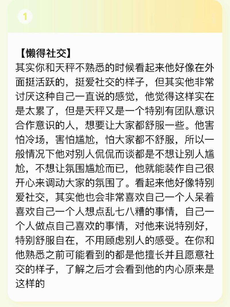 天秤座的懶惰有時(shí)也會(huì)表現(xiàn)在社會(huì)交往中。他們喜歡避免不必要的沖突和紛爭(zhēng)。因此,他們可能會(huì)選擇不參與某些社交活動(dòng)或回避與某些人打交道,以維護(hù)他們的平靜。