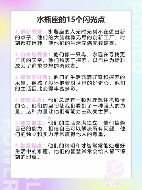 創(chuàng)新能力:水瓶座具有獨(dú)創(chuàng)性,善于打破常規(guī)。他們能提出新穎的解決方案,并勇于挑戰(zhàn)傳統(tǒng)觀念。