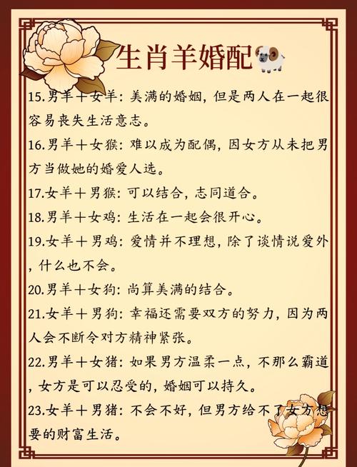 生肖婚配是古老的傳統(tǒng)文化,有一定的參考價(jià)值,但不可盲目迷信?!吨芤住分刑岬剑ぶg存在相生相克的關(guān)系。傳統(tǒng)上,屬羊女與屬馬、屬豬、屬兔的男性較為相合,象征著婚姻美滿,家庭幸福。而與屬牛、屬鼠、屬狗的男性則可能存在沖突,容易產(chǎn)生矛盾,影響婚姻質(zhì)量。