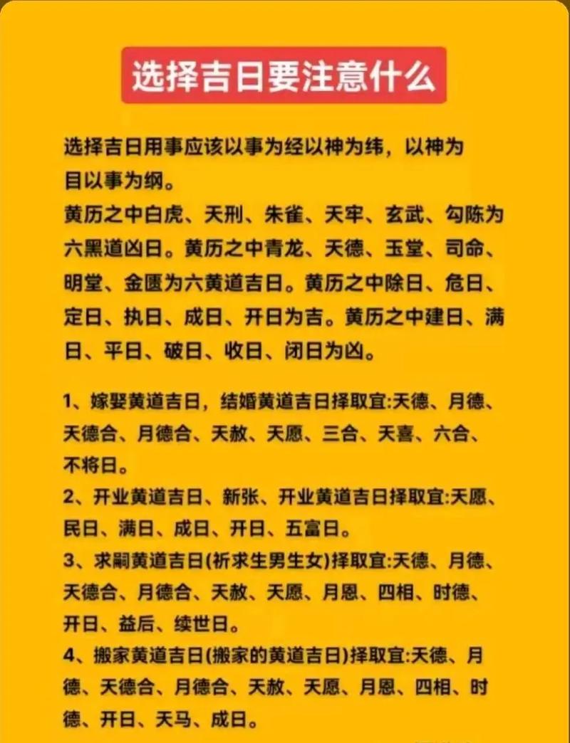 要考慮黃道吉日與黑道兇日。黃道吉日,是指青龍、明堂、金匱、天德、玉堂、司命六個(gè)黃道星值日的日子,被認(rèn)為是諸事皆宜的吉日。黑道兇日,則是指天刑、朱雀、白虎、天牢、玄武、勾陳六個(gè)黑道星值日的日子,被認(rèn)為是諸事不宜的兇日。