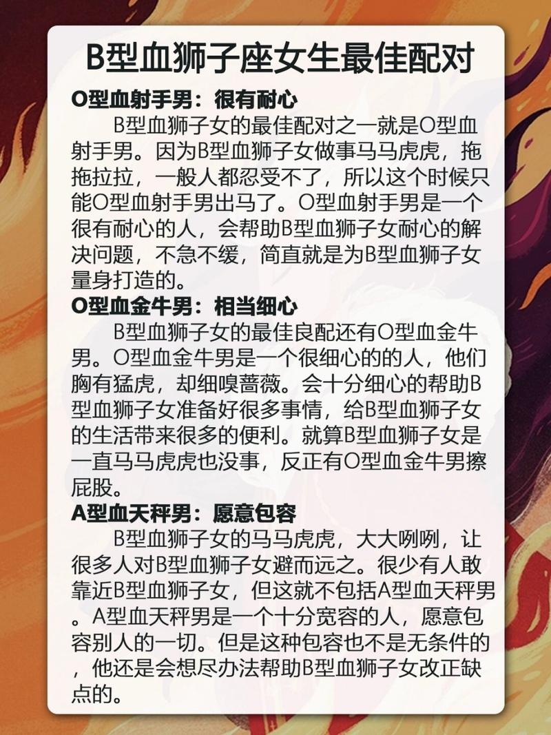 B 型血女人與獅子座的結(jié)合,成就了一位自信非凡、創(chuàng)造無限的非凡女性。她們身上洋溢著獅子座的熱情奔放與 B 型血的灑脫不羈,形成了一股獨(dú)特的魅力。