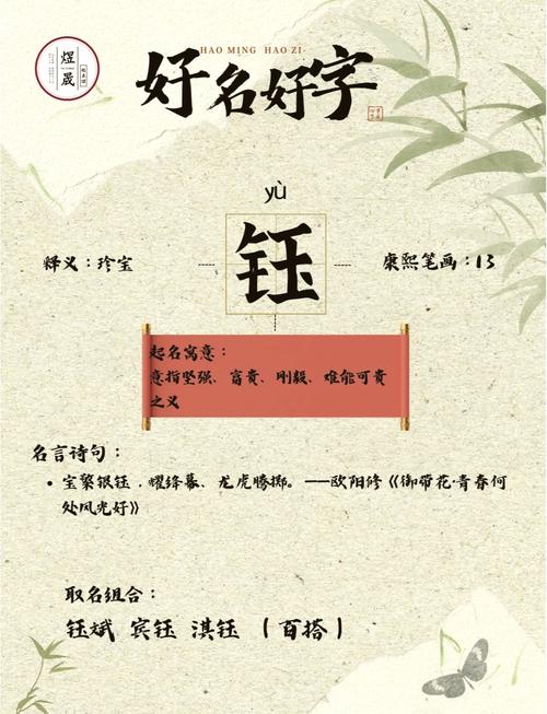 4. 寓意分析: “鈺”字寓意美好、珍貴、堅(jiān)強(qiáng)。在起名時(shí),可以圍繞這些寓意展開(kāi),選擇與之相呼應(yīng)的字。例如,選擇寓意智慧、善良、美麗的字,能夠進(jìn)一步強(qiáng)化名字的積極意義。