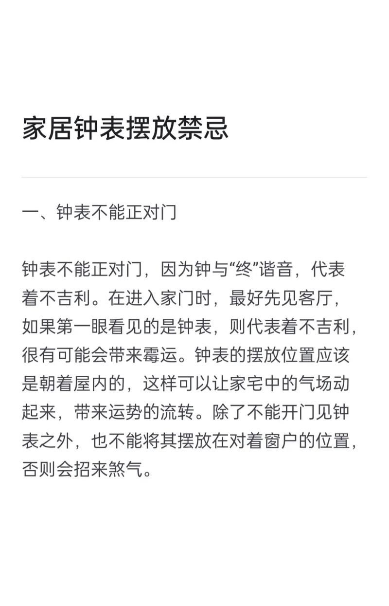 1. 避免正對門:鐘表不宜正對大門擺放,因為“鐘”與“終”諧音,可能會讓人聯(lián)想到不吉利的含義。