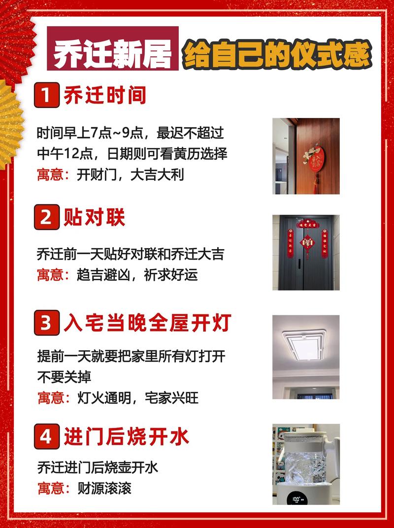 除了化解煞氣,喬遷時還需要注意一些吉利的風水元素。例如,房屋的大門要朝向吉利的方向,房屋的內(nèi)部布局要合理,房屋周圍的花草樹木要種植吉祥的品種。