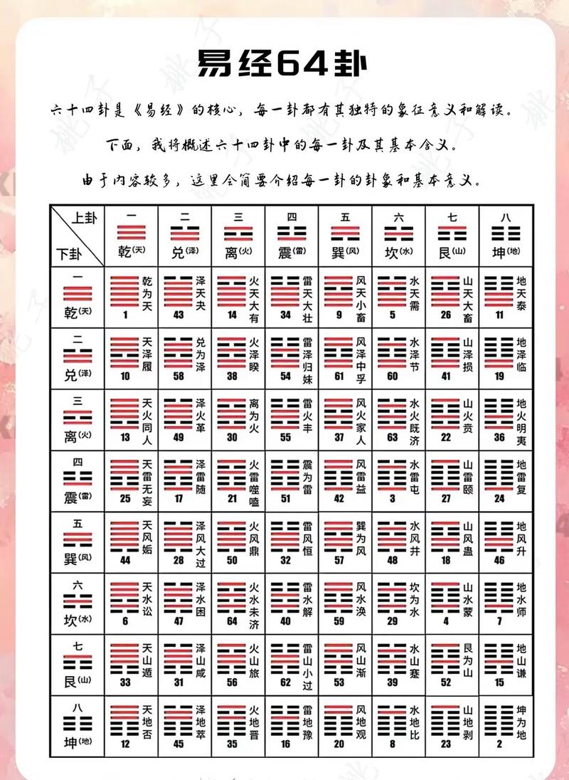 六十四卦是《易經(jīng)》的核心內(nèi)容,每一卦都有其獨(dú)特的象征意義和解釋。以下是六十四卦的名稱及其象征意義:
