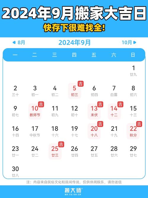 9月,秋高氣爽,是搬家的理想時(shí)節(jié)。選擇一個(gè)黃道吉日搬家,寓意著喬遷新居后的生活順順利利、吉祥如意。吉日的選擇并非隨意,需要參考農(nóng)歷、黃歷等傳統(tǒng)歷法,結(jié)合個(gè)人生辰八字,才能找到真正適合自己的搬家良辰吉日。本文將深入解析9月適宜搬家的黃道吉日,并提供專業(yè)的吉日選擇建議,助您順利喬遷。
