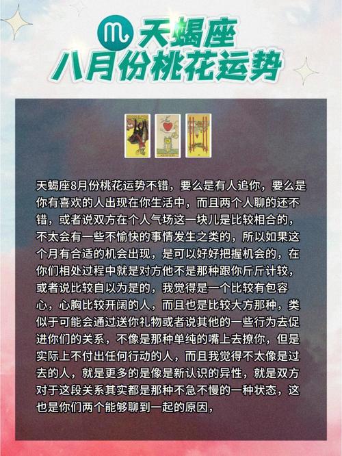 2024年8月底,天蝎座的桃花運勢整體較好,單身者有機會遇到心動對象,有伴者則需要加強溝通和理解。面對復雜的情感形勢,天蝎座需要保持冷靜和理性,避免被短暫的激情沖昏頭腦,通過自我成長和提升情感智慧,更好地應(yīng)對情感中的挑戰(zhàn)。