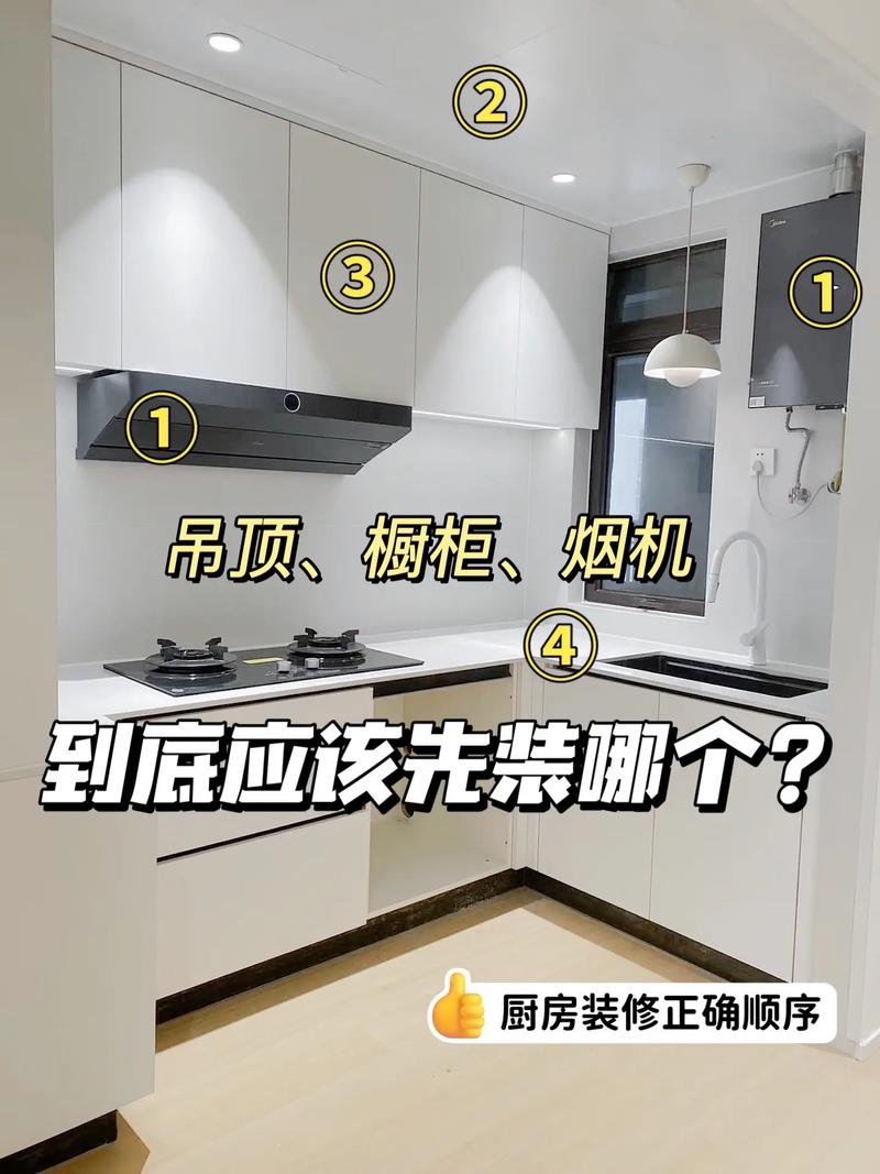 先安裝吊柜、地柜,再安裝臺面和電器。布局應(yīng)合理,確保操作流暢。