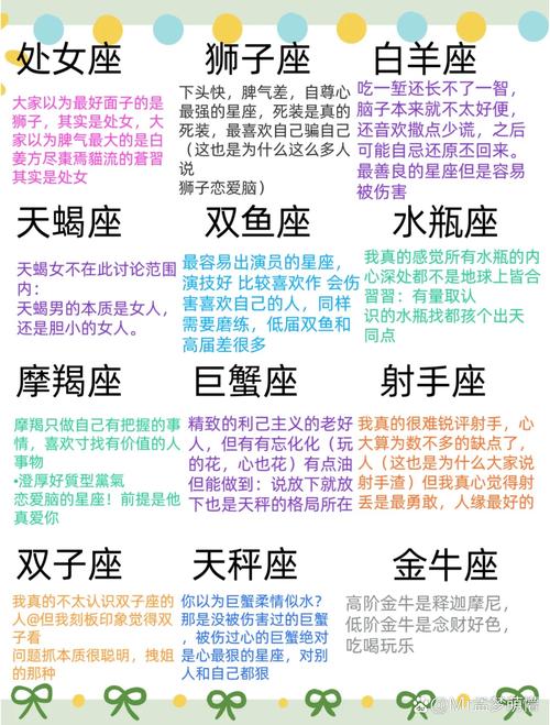 星座與性格的關(guān)聯(lián):星座與性格之間也存在一定的關(guān)聯(lián),這種關(guān)聯(lián)可能會影響人們對面相的解讀。例如,某些星座的人可能被認(rèn)為具有特定的性格特征,這些特征可能會影響他們的面部表情和神態(tài)。